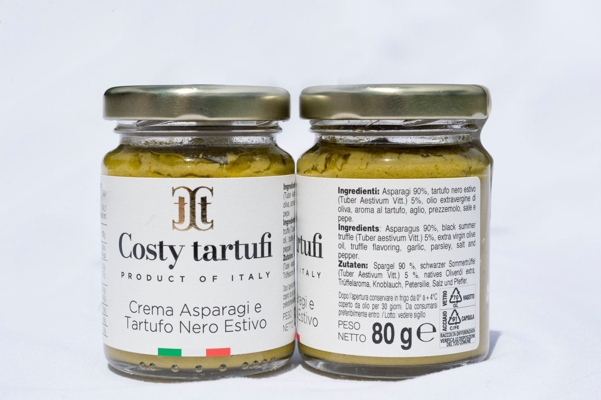 La delicatezza degli asparagi incontra il tartufo nero estivo (Tuber Aestivum Vitt.) trasformandosi in una morbida crema spalmabile, grazie anche alla presenza del pregiato olio E.V.O.