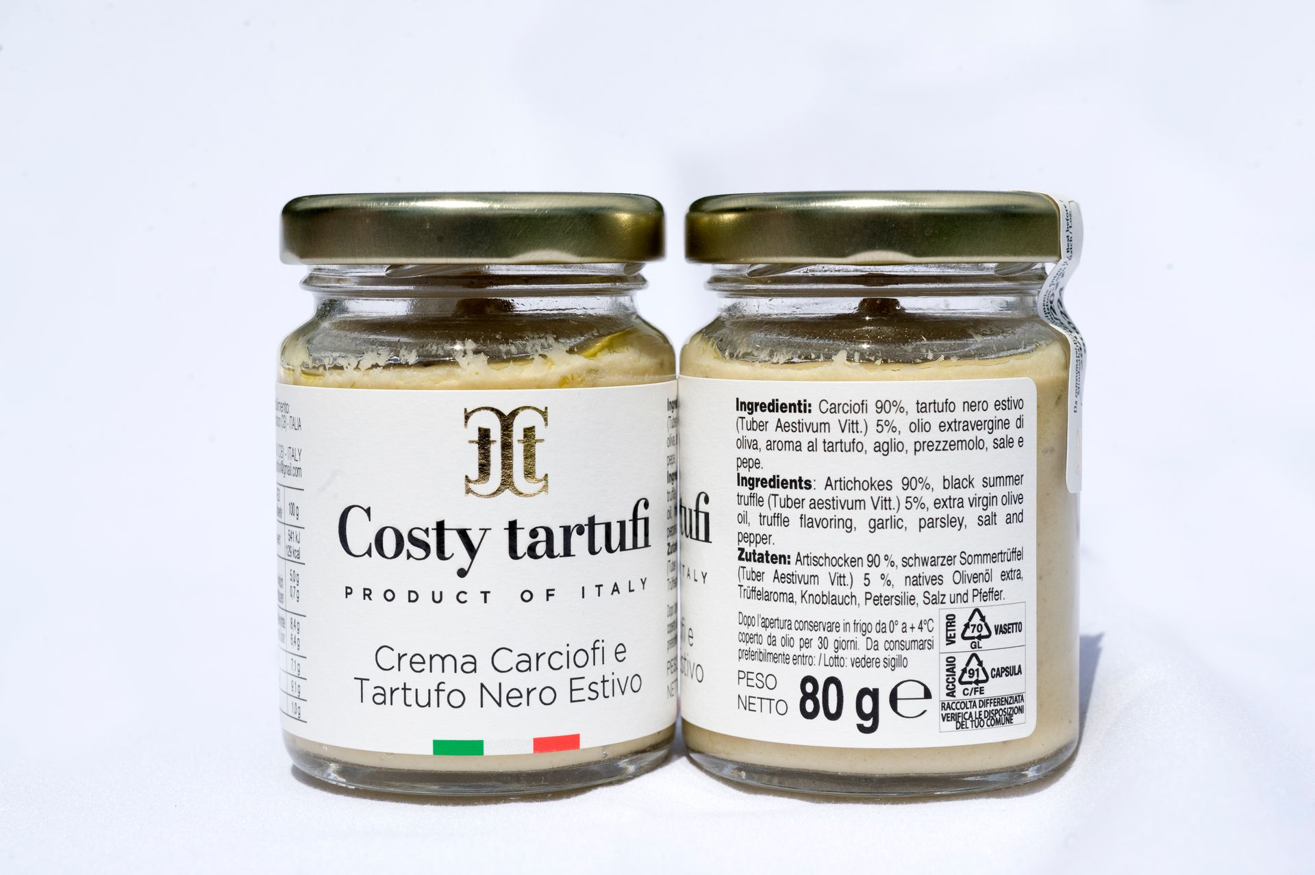 Una deliziosa crema spalmabile nata dal perfetto connubio dei carciofi con il tartufo nero estivo (Tuber Aestivum Vitt.) con l'aggiunta di pregiato olio E.V.O.